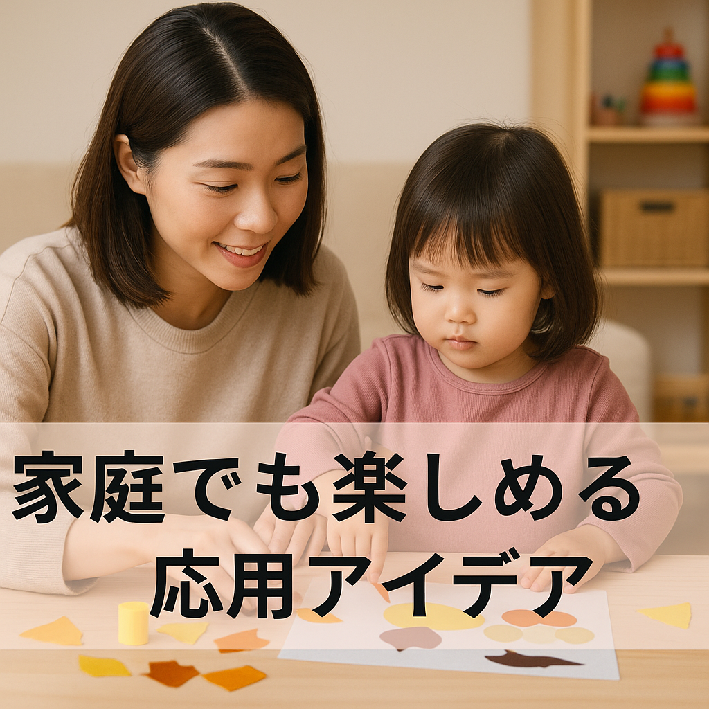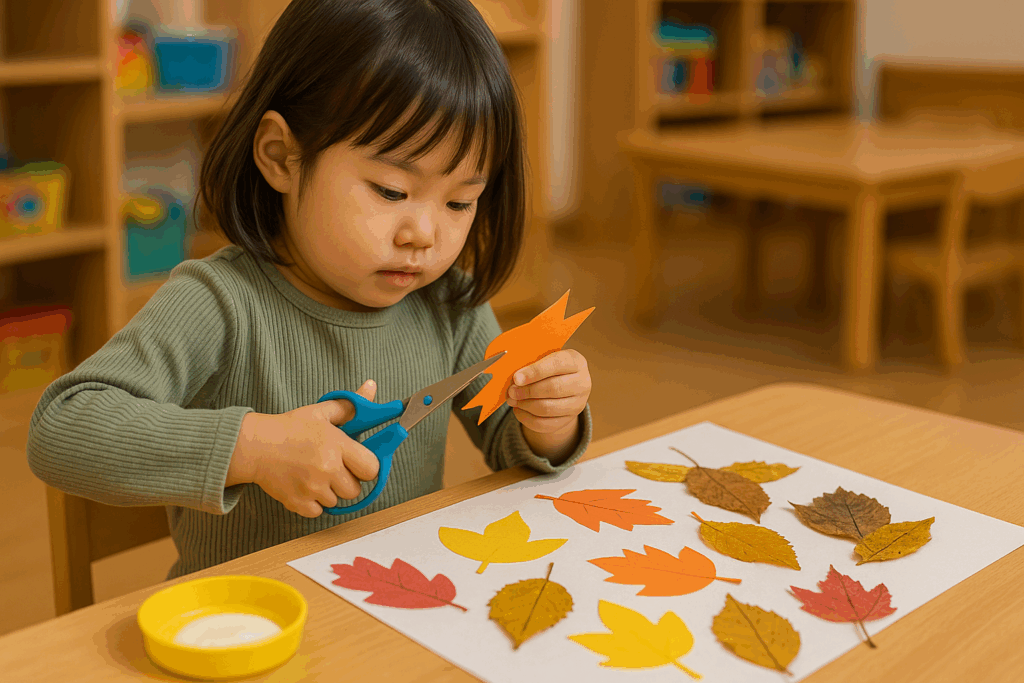 家庭では、散歩で拾った落ち葉を使って親子でコラージュを楽しめます。子どもが切った紙の葉っぱと本物の落ち葉を組み合わせると、自然の魅力が伝わる素敵な作品になります。