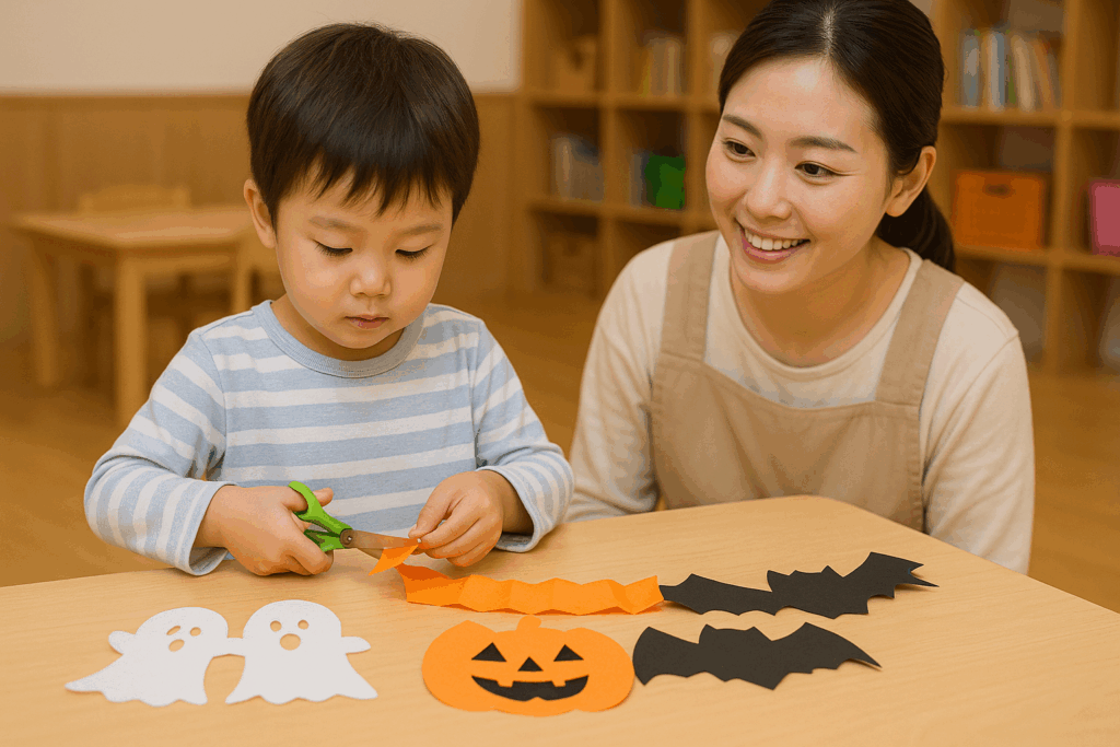 画用紙をじゃばら折りにして、簡単なおばけやコウモリの型を切り抜くと、つながったガーランドができます。はさみで直線や少しの曲線を切る練習になり、切ったあと広げると「わぁ!」と驚きの声が上がります。飾りとしても使えるので、保育園の壁面や家庭でのイベント演出にも役立ちます。