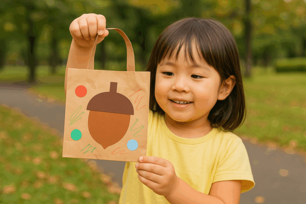 秋の散歩で拾ったどんぐりを入れる「どんぐりバッグ」を製作するのもおすすめです。紙袋や画用紙をベースに、持ち手を子どもが切って貼り付けます。シールやクレヨンで模様を描けば、オリジナルバッグの完成。散歩のときに使うと、製作と生活がつながり、より楽しめます。