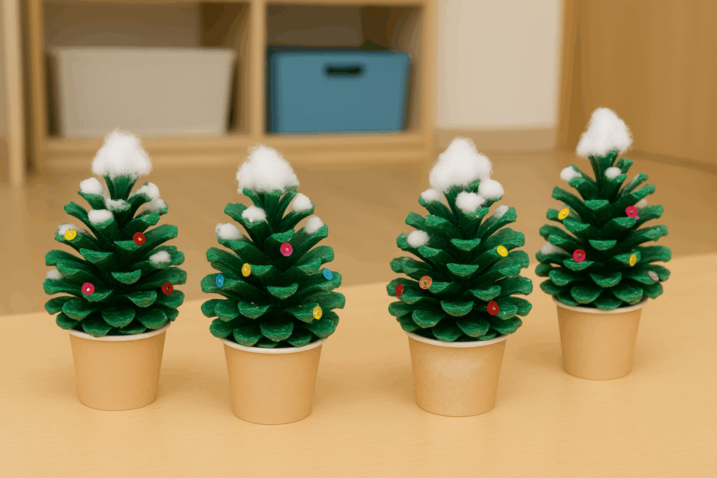 まつぼっくり、絵の具(緑・白・金など)、綿、スパンコール、のり