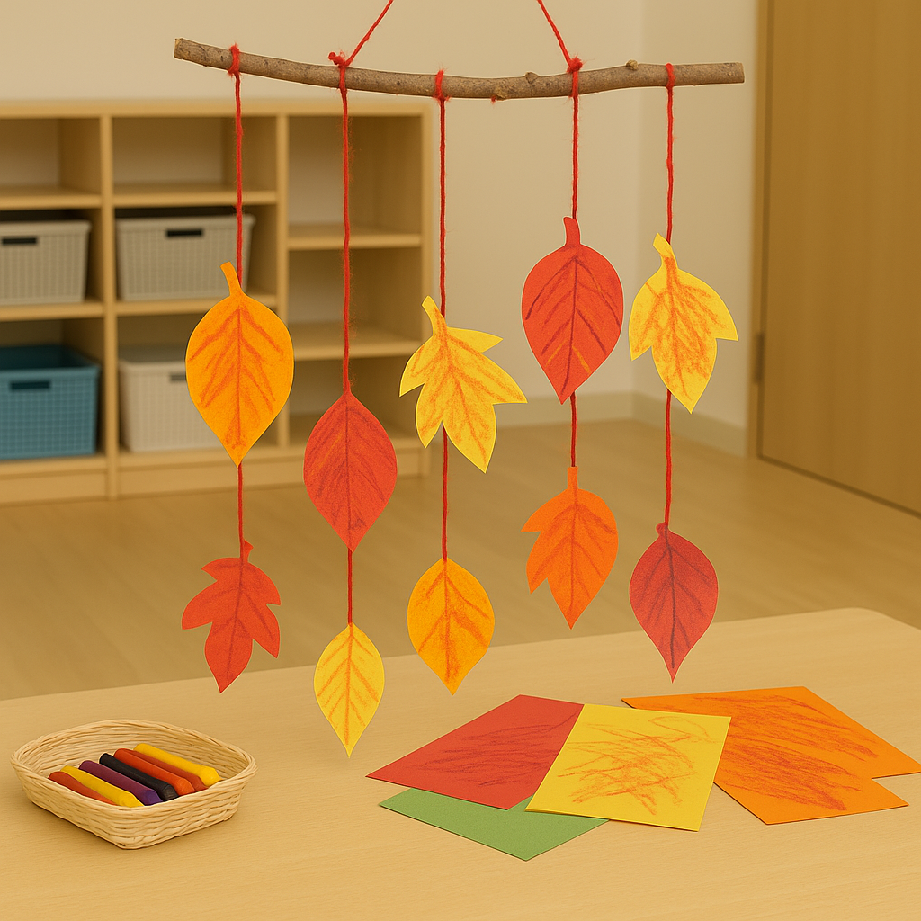 また、落ち葉モビールの前には『どんぐりころころ』の歌を歌ったり、散歩で素材集めをしたりするのもおすすめです。