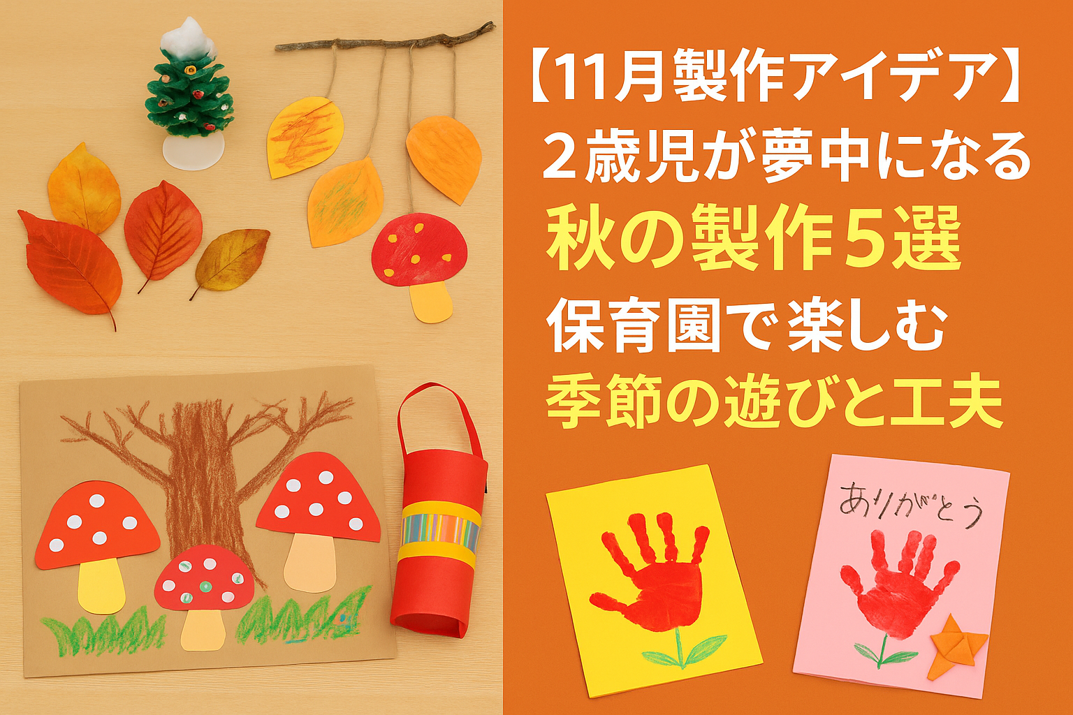 この時期の製作では、「ちょっとだけ難しいこと」に挑戦できる環境づくりが大切。保育士が少し手を添えるだけで、子どもたちは「できた!」という達成感を味わうことができます。季節の行事(七五三・勤労感謝の日)にもつなげやすい時期なので、テーマ性のある活動を取り入れるのもおすすめです。