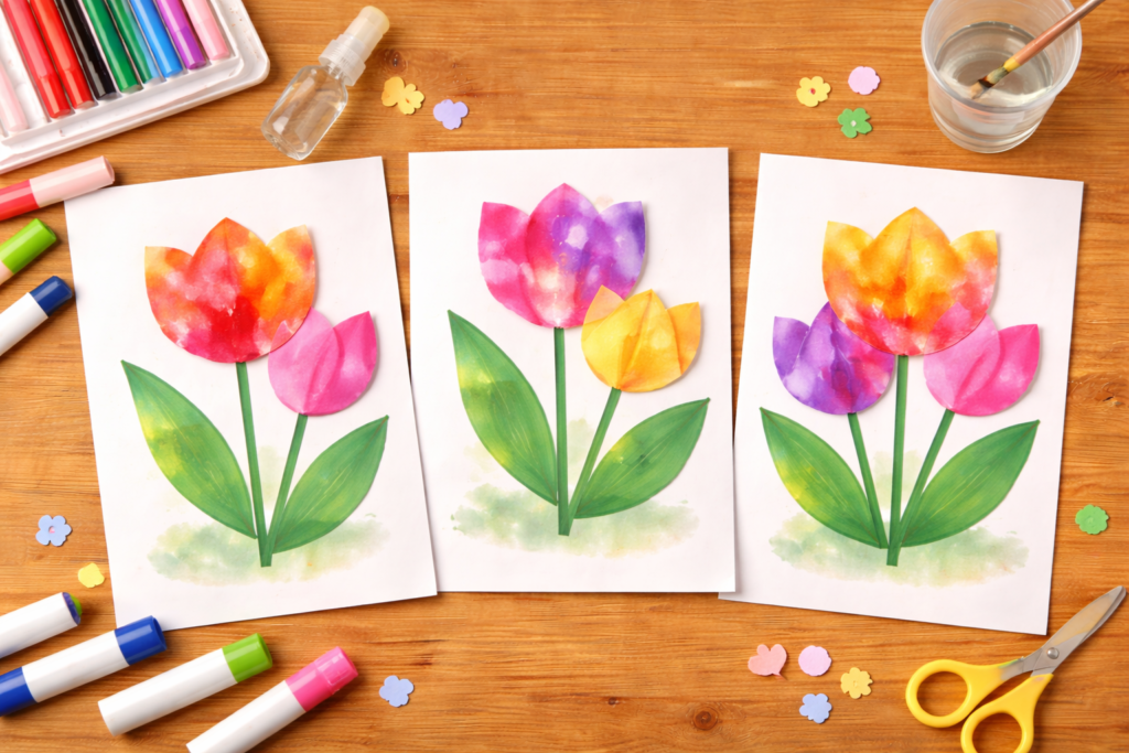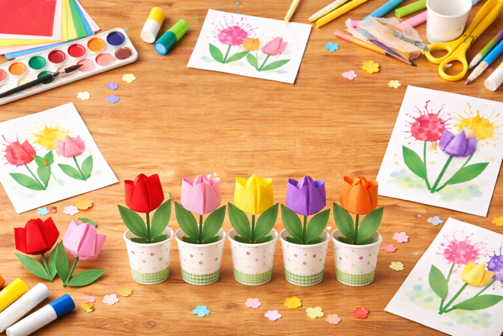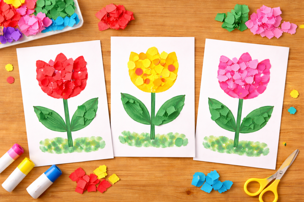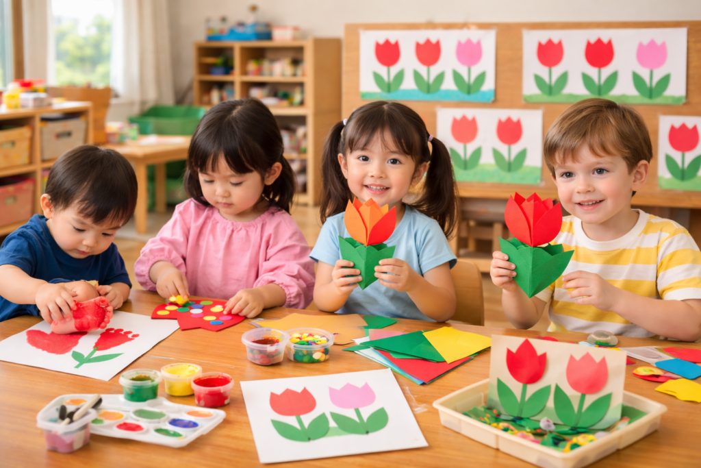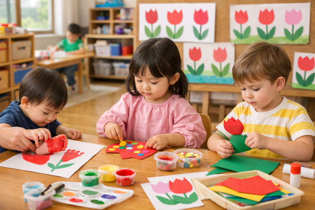 また、チューリップ製作は乳児から幼児まで幅広い年齢で楽しめる活動でもあります。スタンプやシール貼りなどの簡単な活動から、折り紙や立体製作まで、年齢に合わせてアレンジできるのが魅力です。