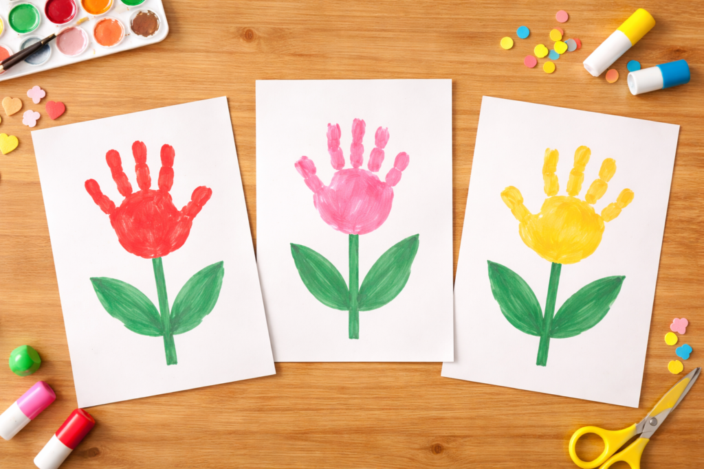 手形を花びらに見立てた製作です。カラフルな手形を押すと、かわいいチューリップが完成します。