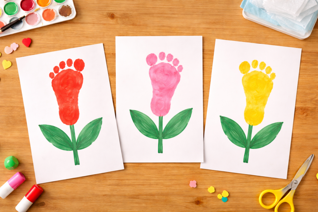 乳児クラスでは、足形スタンプを使ったチューリップ製作がおすすめです。足の形がそのまま花のようになるため、とてもかわいい作品になります。