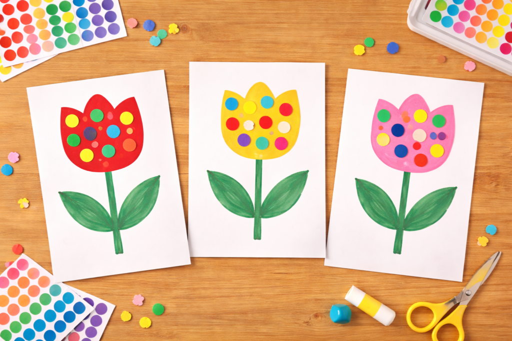 シール貼りは、小さな子どもでも取り組みやすい製作活動です。チューリップの形の画用紙を用意し、花びら部分に丸シールを貼るだけでカラフルな作品が完成します。