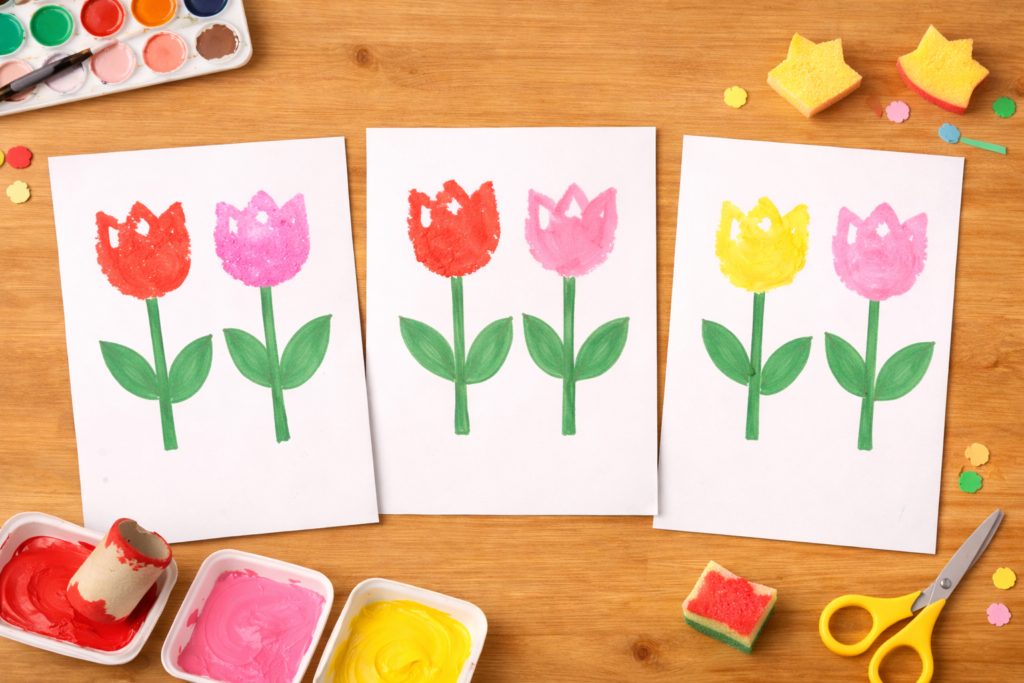 チューリップは形がシンプルで、保育園でも取り入れやすい春の製作テーマです。スタンプやシール貼りなどの簡単な活動から、折り紙や立体製作まで、年齢に合わせてさまざまな楽しみ方ができます。