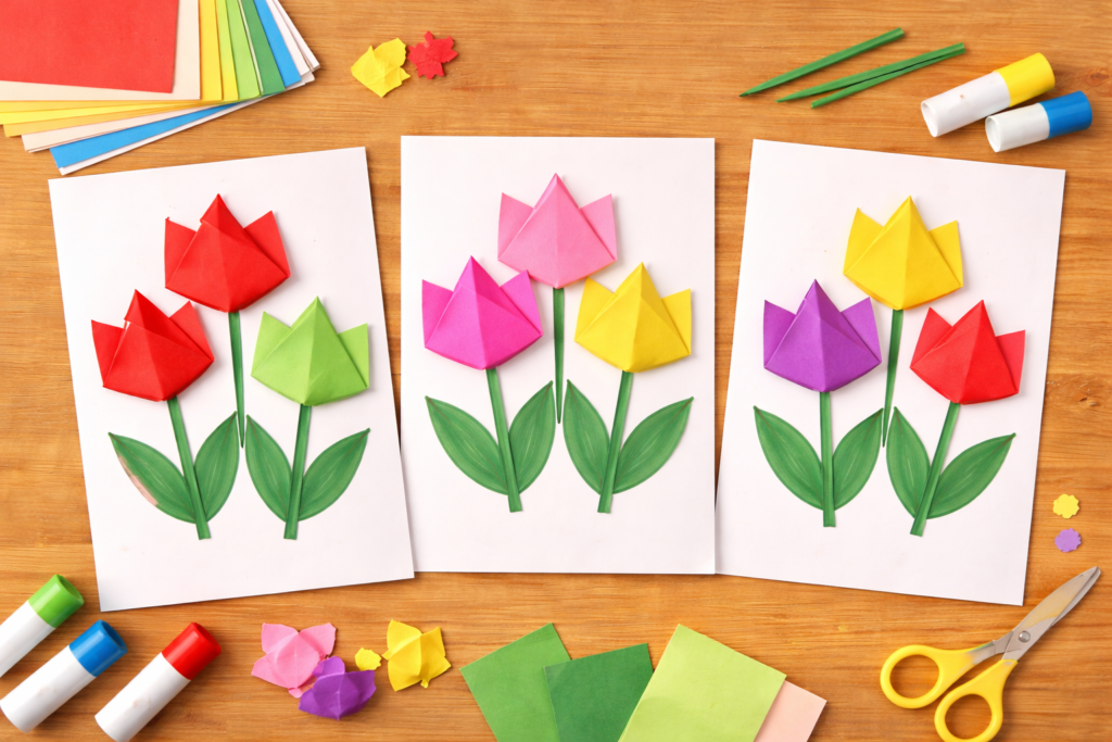 3歳児頃になると、簡単な折り紙製作も楽しめるようになります。折り紙を三角に折り、チューリップの形にして画用紙に貼ります。