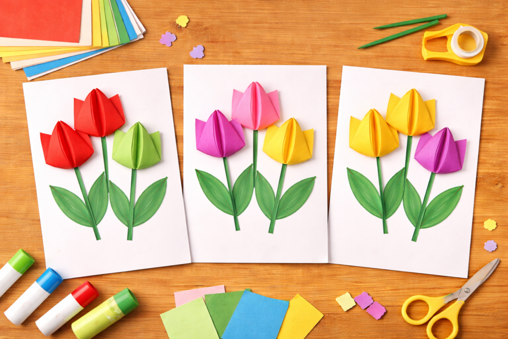 折り紙でチューリップを作り、画用紙に貼る定番の製作です。