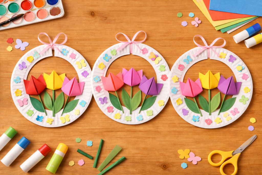 紙皿を使って春のリースを作る製作です。壁面飾りにもおすすめです。