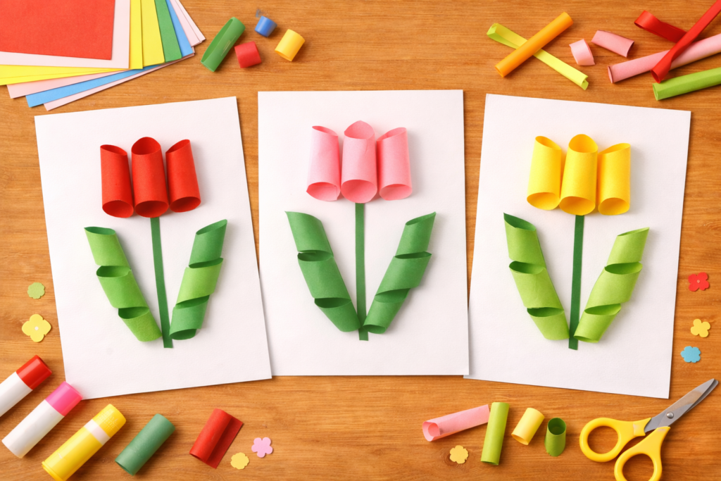 年長児クラスでは、立体製作にも挑戦できます。同じ形の花びらを複数枚作り、半分に折って貼り合わせることで立体のチューリップが完成します。