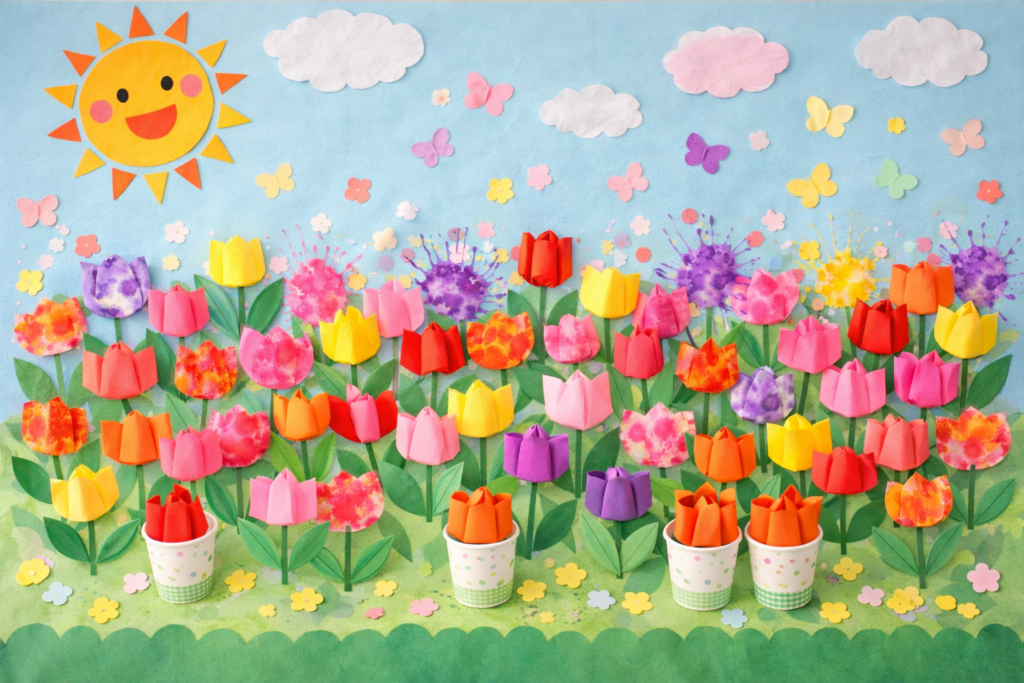 製作では、見本通りに作るだけでなく、子どもたちが好きな色を選べるようにすると個性が出ます。カラフルなチューリップが並ぶと、保育室も華やかになります。